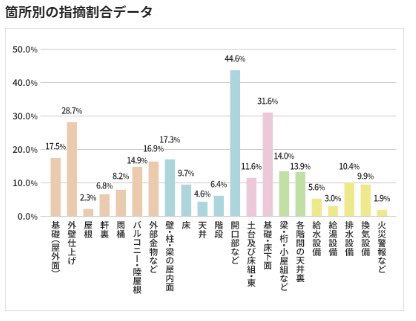 開口部に次いで多かったのは「外壁仕上げ(28.7%)」と「基礎・床下面(31.6%)」です。外壁や基礎の不具合は、雨漏りなどを誘発し、将来的に建物の構造に関わってくる危険性があります。