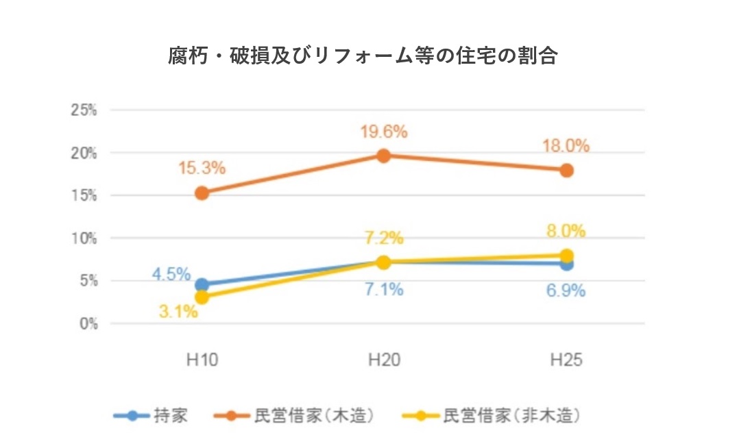 総務省のデータによると、腐朽・破損及びリフォームなどの住宅割合は、木造の民営借家で全体の20%程度、非木造の民営借家は10%弱で推移しています。