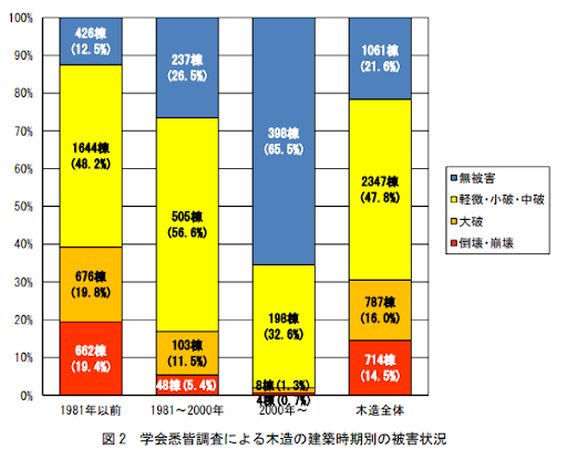 なお、2000年基準で倒壊・崩壊した4棟のうち2棟は、壁の配置規定を満たしておらず、かつ1棟は壁の量規定も満たしていなかったことがわかっており、残りの2棟のうち1棟も関係者の情報により壁量規定を満たしていなかったと考えられています。