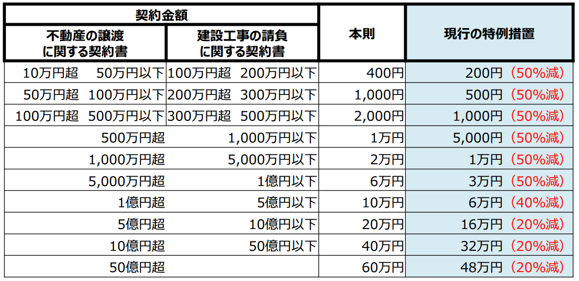 工事請負契約書および不動産売買契約書に貼付する印紙は、上記の現行の特例措置が2026年度まで延長となります。